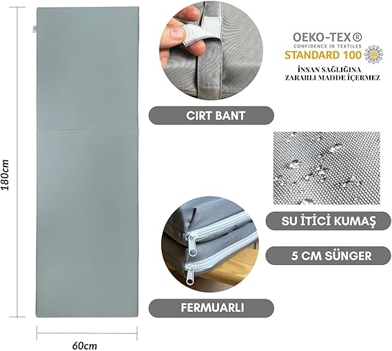 TAŞINIR KATLANIR ŞEZLONG MİNDERİ KAMP MİNDERİ SU İTİCİ KUMAŞ FERMUARLI 5 CM(GRİ)