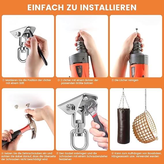 【Çok yönlü kullanılabilir】Tavan askısı beton tavanlarda veya masif ahşap kirişlerde kullanılabilir. Sandalyeler, hamaklar, salıncaklar, jimnastik halkaları, kum torbaları, hava yoga veya tenteleri asmak için idealdir.