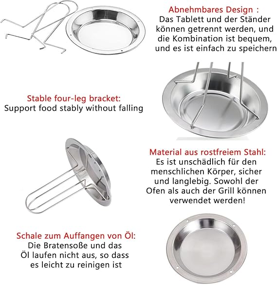 Birinci sınıf malzeme: Katlanabilir tavuk kızartma rafı fırın, yüksek kaliteli paslanmaz çelikten yapılmıştır, dayanıklı, hafif, ısıya dayanıklı, sağlıklı ve güvenli, korozyon ve pas önleyici fonksiyona sahiptir, çizilmesi ve paslanması kolay değildir ve tekrar kullanılabilir