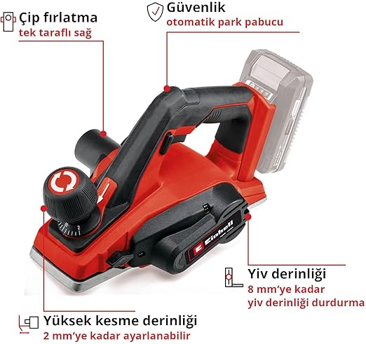 Paralellik kılavuzu, kolayca girintiler yapmak için derinlik stopu, kaliteli yüzey için 1 adet TCT planya bıçağı dahil, 2.5 Ah Plus akü ve üzeri akülerle kullanılması tavsiye edilir