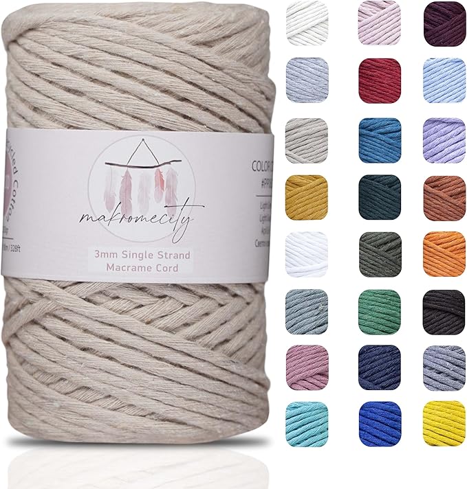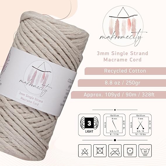 Tek Telli Makrome Kordon 3 mm x 100 Yard (300 ft) 3 mm Tek Telli Latte Pamuk Kordon Makrome Sanat ve El Sanatları Duvar Askıları için Geri Dönüşümlü Pamuk Kordon İpliği DIY (Latte, 1