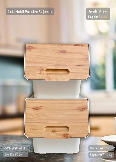Tekerlekli Patates Soğan Sebze Saklama Sepeti, 24 Litre, Bambu Renk