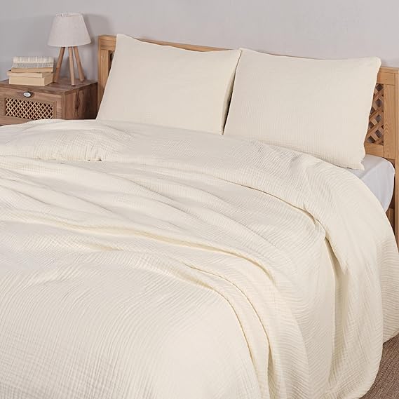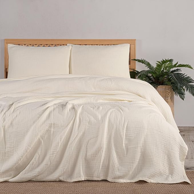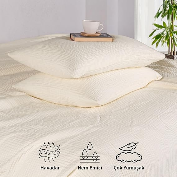 TEKSTIL Müslin Yatak Örtüsü Seti Çift Kişilik, Şık Düz Renk 100% Pamuk 4 Kat Muslin Yastık Kılıflı Pike Takımı, Denizli Üretimi (Natural Renk, Çift Kişilik Set (230×250 cm))