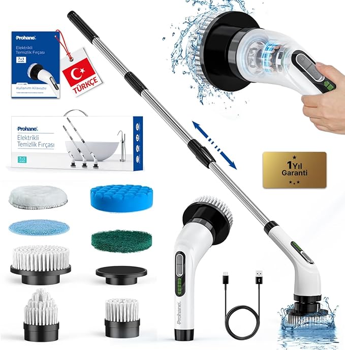 Temizlik Fırçası, Şarjlı Temizlik Fırçası 7 Adet Farklı Başlık ile, Mutfak ve Banyolarda Birçok Temizlik Görevi için, Küvet, Duş, Fayans ve Zemin İçin Temizlik Malzemeleri