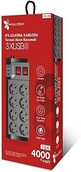 Termal Akım Korumalı Priz, Isıya Dayanıklı, Çocuk Koruması, 8’li Priz, Sekizli, 3 Usb’li, 2 mt Yüksek Akım Dirençli Kablo, Grup Priz Fulltech Ftr-08