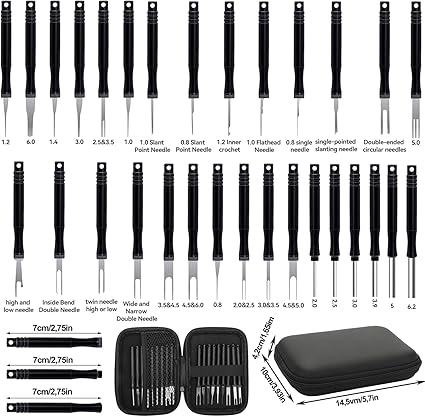 Set 11 adet tek iğne çıkarıcı, 11 çift iğne çıkarıcı, 1 üçlü iğne çekici, 1 tığ çıkarıcı ve 6 uzun saplı yuvarlak borudan oluşur.