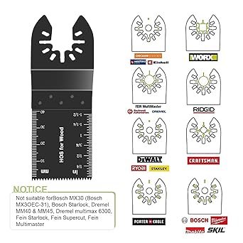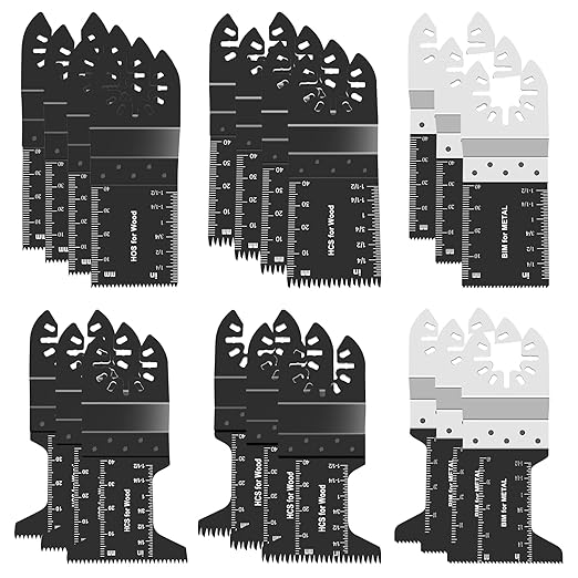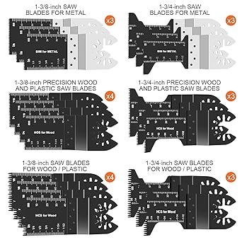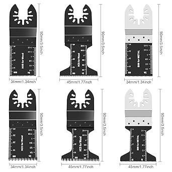【Çok amaçlı bıçak seti】Bu çok amaçlı bıçak ağızlarının toplam 20 bıçağı vardır, bunların arasında 6 farklı salınımlı testere bıçağı vardır. Bunlar: Ahşap için 4 x 34 mm / 1,34 inç HCS (uzun testere dişi); ahşap için 4 x 34 mm HCS (kısa testere dişi); 3 x 45 mm (1,77 inç HCS ahşap için uzun testere dişi); 3 x 45 mm / 1,77 inç HCS ahşap için (kısa testere dişi); 3 x 45 mm/ 1,77 inç HCS ahşap için (kısa testere dişi). musluk); 3 * Metal için 45 mm (1,77 inç) BIM, metal için 3 x 34 mm (1,34 inç) BIM.