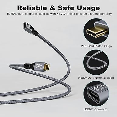 4K Ultra HD USB – C 3.2 Uzatma Kablosu: Bu kablo USB – C bağlantınızı genişletir ve bir USB – C cihazından bir monitöre, güç adaptörüne veya veri depolama cihazına bağlanmanıza olanak tanır, dizüstü bilgisayarınız, cep telefonunuz veya diğerleri için video, şarj veya veri aktarım işlevlerine izin verir. USB-C konektörünün dişi ucunda, bağlantıyı yapmak için başka bir USB – C erkek – erkek kabloya ihtiyacınız olacak