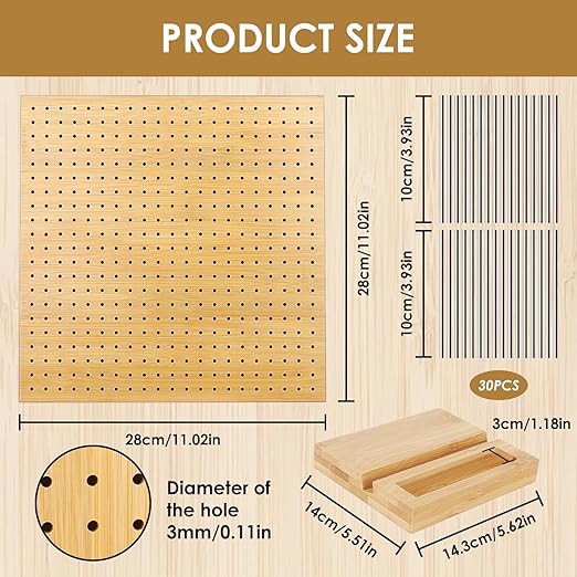 Pratik ve rahat: Tığ işi blok boyutu 29 cm / 11 inç x 29 cm / 11 inç, 3 mm çaplı delikler, 30 adet paslanmaz çelik çubuk pim ve kompakt ahşap taban. Bu set tığ projeniz için çok uygundur.