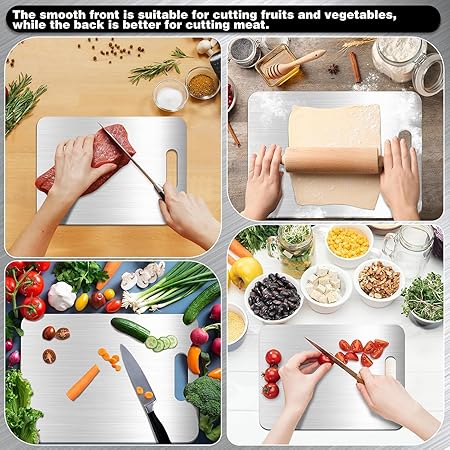 【ÇİFT TARAFLI】 Bu titanyum kesme tahtası iyi düşünülmüş çift taraflı bir tasarım sunar: Ön tarafı pürüzsüz ve hassastır, meyve ve sebze gibi yumuşak malzemeleri kesmek için mükemmeldir, arka tarafı et gibi sert yiyecekler için özel olarak tasarlanmıştır. Bu yenilikçi tasarım sadece farklı malzemelerin farklı gereksinimlerini karşılamakla kalmaz, aynı zamanda çapraz kontaminasyon riskini en aza indirir ve gıda güvenliği standartlarını önemli ölçüde iyileştirir.