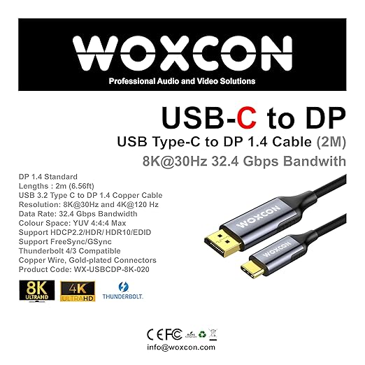 to Display Port Cable, DP1.4, USB 3.2 Standart, 8K 30Hz, 4K 120Hz Desteği, Thunderbolt 4, Thunderbolt 3, 2 Metre, En Yeni Model