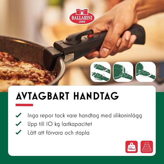 Yer tasarruflu: BALLARINI Torre kızartma tavasının çıkarılabilir sapı ile mutfağınızda değerli depolama alanı kazanırsınız. Sadece sapı çıkarın, tavaları istifleyin ve mutfak dolabınız derli toplu görünür. Her santimetrenin önemli olduğu küçük mutfaklar için idealdir.
