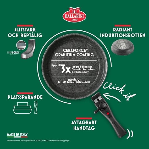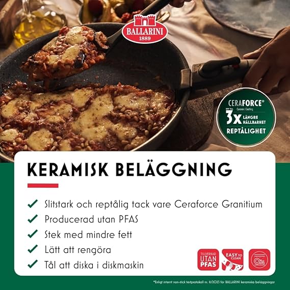 Sağlıklı pişirme: Yenilikçi CERAFORCE Granitium seramik kaplama az yağlı kızartma sağlar ve sağlıklı bir yaşam tarzını destekler. Ayrıca kaplama önceki seramik kaplamalarımızdan üç kata kadar daha dayanıklıdır* (*BALLARINI seramik kaplamalar için dahili yapışmaz test protokolü No. 11/2023) ve PFAS olmadan üretilmiştir – kaygısız keyif için.