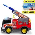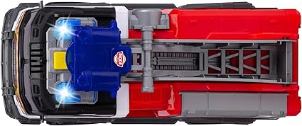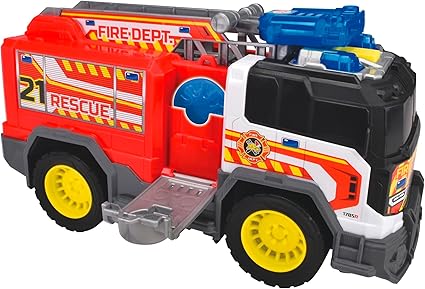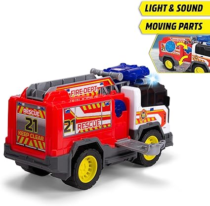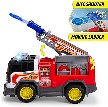 30 santimetre uzunluğundaki serbest tekerlekli itfaiye aracı, oyun ve sürüş deneyimi sunar, oyuncak arabanın merdiveninde su ve drone motifli tasarıma uygun disk atıcı bulunur, çocuklar birlikte verilen iki diski fırlatabilir