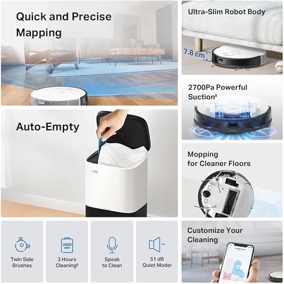TP-Link RV20 Mop Plus, MagSlim LiDAR Navigasyonlu Robot Süpürge ve Paspas+ Akıllı Otomatik Boşaltma İstasyonu, 2700Pa Güçlü Emiş, 3 Saat Kesintisiz Temizlik