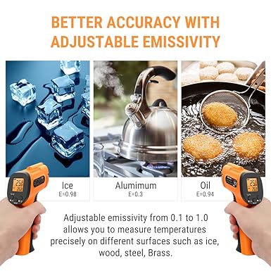 YÜKSEK DOĞRULUK VE HER YÜZEYE AYARLANABİLİR – En son termopil sensör teknolojisi ile tasarlanan bu kızılötesi lazer termometre tabancası, ±%1,5’e kadar doğrudur; Emisiviteyi hedef yüzey malzemesine uyacak şekilde 0,1’den 1,0’a ayarlayarak IR termometre tabancası ölçümlerini iyileştirebilirsiniz