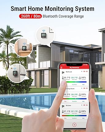 80 m’ye kadar Bluetooth Uzak Menzil: Oda termometresi odası, her zaman tam ev kapsamına sahip olmanızı sağlamak için istikrarlı, güvenilir bir 80m/260ft Bluetooth uzak menzili (engelsiz) üretmek için gelişmiş bir Bluetooth Teknolojisi içerir