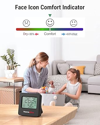 Yüz Simgesi Konfor Göstergeleri: Ev için iç mekan termometresi özellikleri yüz simgeleri rahatlık KURU/KONFORLU/ISLAK hava koşullarını anlaşılması kolay bir biçimde gösterir ve nemlendiricinizi veya nem gidericinizi buna göre ayarlamanıza olanak tanır