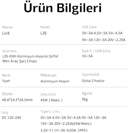 Transparent 45W PD/QC Type C ve USB Çıkış Ultra Hızlı Mini Araç şarj Cihazı L35
