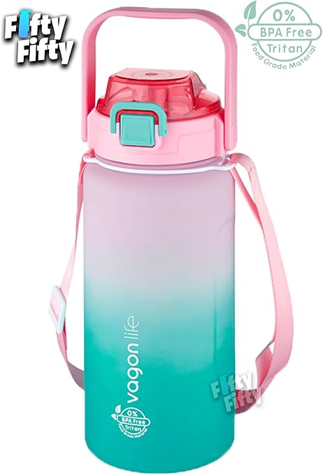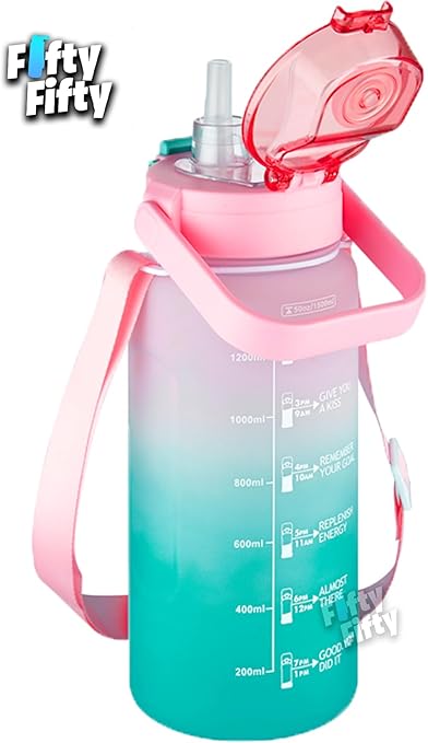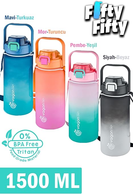 Tritan 1500ml Askılı-Pipetli/Pipetsiz Kullanım Çift Renk SoftTouch Motivasyon Matarası Çıkartma Hediyeli