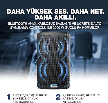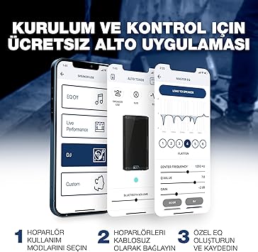 ALTO Uygulaması – Bluetooth seviyeleri üzerinde uzaktan yapılandırma ve kontrol için iOS ve Android uyumludur, hoparlör kullanım modları, alt boyut seçimi ve istenmeyen geri bildirimleri kaldırmak için özel EQ