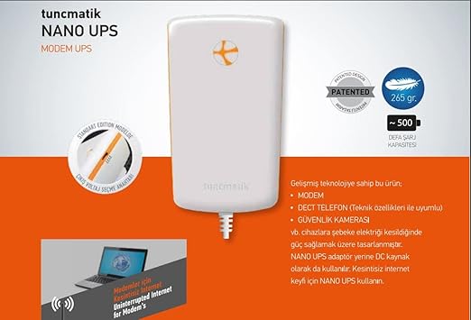 MODEM DECT TELEFON (Teknik özellikleri ile uyumlu) GÜVENLİK KAMERASI vb. cihazlara şebeke elektriği kesildiğindegüç sağlamak üzere tasarlanmıştır. NANO UPS adaptör yerine DC kaynak olarak da kullanılır. Kesintisiz internet keyfi için NANO UPS kullanın.