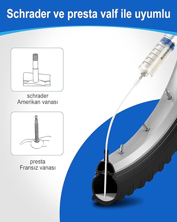 [Kullanımı Kolay] İç lastiksiz lastik dolgu macunu enjektör tüpü 20 cm uzunluğundadır, şişelerden sıvı çekmeyi kolaylaştırır ve Schrader veya Presta valf ile uyumludur.