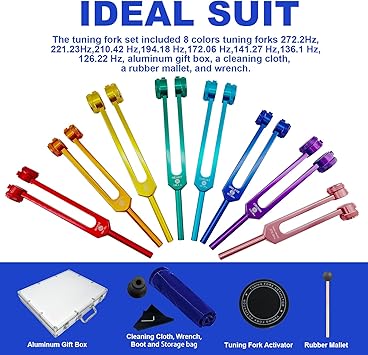 DAHİL – Terapötik ayar çatallarımız 126.22Hz, 136.1Hz, 141.27Hz, 172.06Hz, 194.18Hz, 210.42 Hz, 221.23Hz, 272.2Hz içerir. Çakra çatalları alüminyum kasa, temizleme bezi, lastik tokmak, anahtar, uygun kese, kristal taş ve ayar çatalı aktivatörü ile birlikte gelir.
