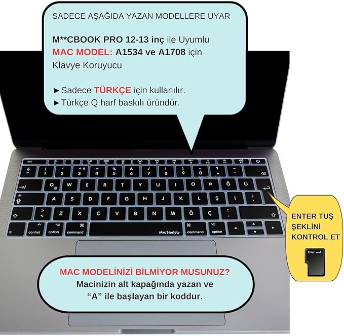 Türkçe Q Klavye Koruyucu – 12 inç ve Pro 13 inç – İnce Silikon – A1534 A1708 Siyah