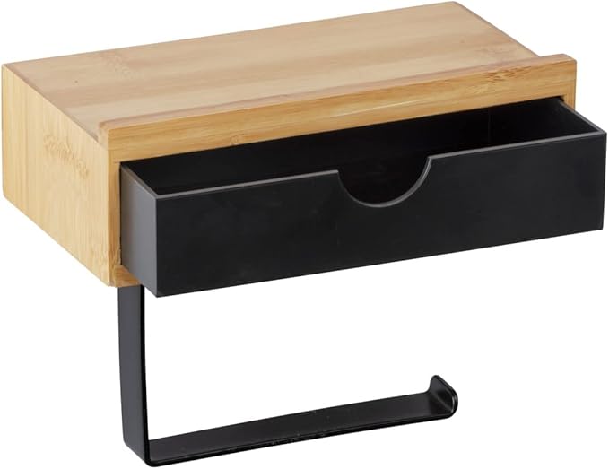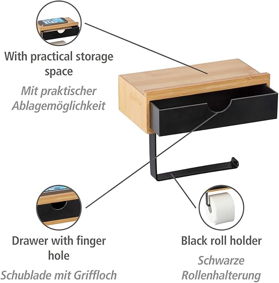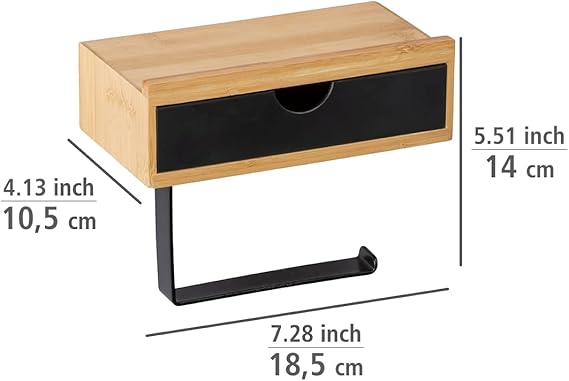 Teslimat kapsamı: Raf ve çekmeceli yedek tuvalet kağıdı tutucusu “Bambusa”, siyah, yüksek kaliteli bambudan yapılmıştır (genişlik x yükseklik x derinlik): 18,5 x 14 x 10,5 cm, duvara monte edilebilir, montaj malzemesi dahildir.
