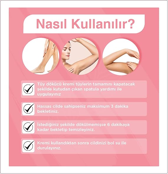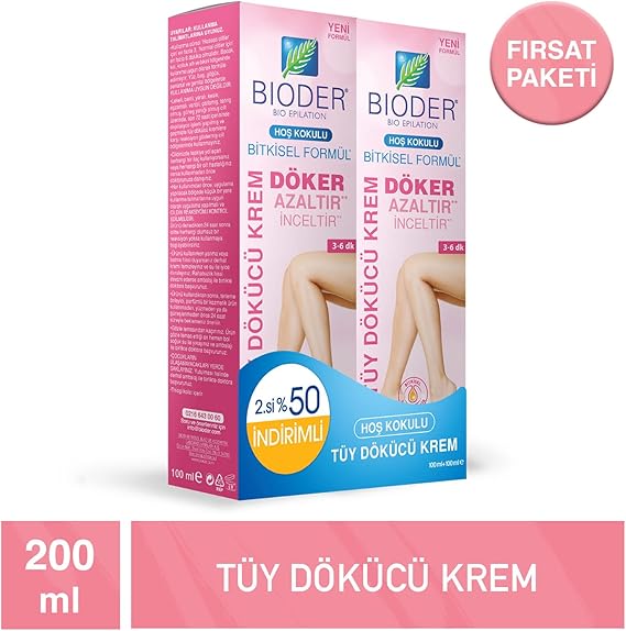 İçeriği: 2 adet 100 ml Bioder Tüy Dökücü Kremi: Uygun ciltler için en fazla 3, normal ciltler için en fazla 6 dakika kullanın. Özel olarak bacak, kol, koltuk altı ve bikini bölgesinde tasarlanmıştır. Yüz, baş, göğüs, perianal ve genital bölgelerde kullanılmamalıdır.
