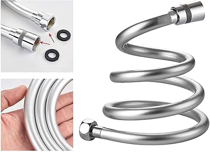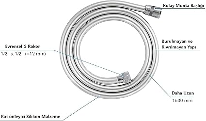Twistfree Lüx PVC Duş Hortumu/Duş Spirali/Paslanmaz Bağlantı Uçlu 150 Cm Gümüş