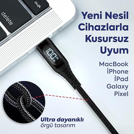 DAYANIKLI VE ŞIK TASARIM: Yüksek kaliteli örgülü kablo yapısı, günlük kullanımın zorluklarına karşı ekstra dayanıklılık sunar. Modern ve şık görünümüyle öne çıkar.