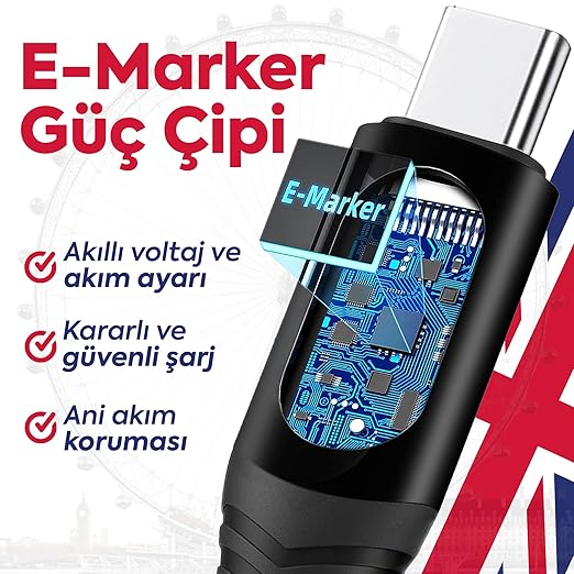 AKILLI E-MARK ÇİP TEKNOLOJİSİ: Cihaza uygun optimum güç sağlayarak hem hızlı hem de güvenli şarj imkanı sunar.