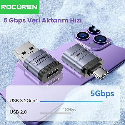 Ürün Adı: Rocoren Type-C to USB 3.2 5Gbps OTG Çevirici Dönüştürücü Adaptör – Type-C (Erkek) – USB-A (Dişi)