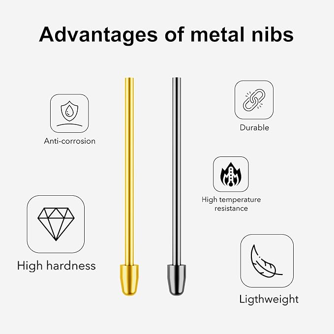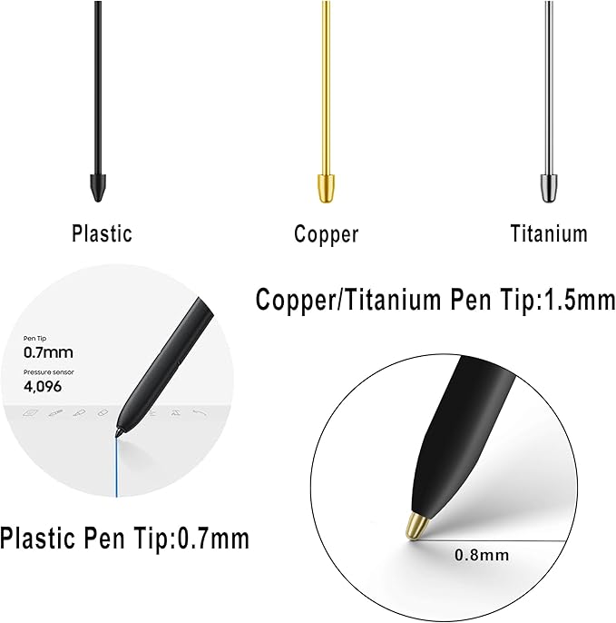 Titanyum/Bakır uçların avantajları: Dayanıklı, aşınmaya dayanıklı, hafif, güzel, plastik uçlara kıyasla yıpranmaz veya kırılmaz, dolma kalemlerle uzun süre kullanılabilir. Uç pürüzsüzdür ve ekranı çizmesi kolay değildir, tıpkı kağıda yazılan bir dolma kalem gibi, pürüzsüz bir yazma deneyimi ve ekranı korumak için bir ekran koruyucu önerilir.