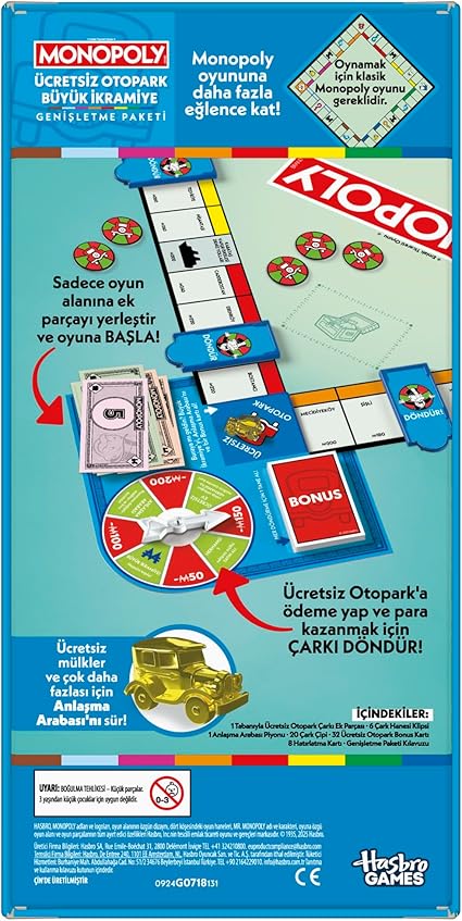 KLASİK MONOPOLY OYUNUNA YENİ BİR SOLUK: Monopoly Ücretsiz Otopark Büyük İkramiye Genişletme Paketi ile Monopoly oyununu renklendirin ve daha kısa sürede oynayın! BU BİR GENİŞLETME PAKETİDİR, TEK BAŞINA BİR OYUN DEĞİLDİR. (OYNAMAK İÇİN KLASİK MONOPOLY OYUNU GEREKLİDİR. Her biri ayrı satılır)