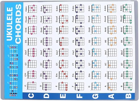 ZENGİN AKOR ÇİZELGELERİ: Bu ukulele akor tablosu, geniş yelpazede akor diyagramları sunarak öğrencilerin farklı akorlar için parmakları ve konumları hızlı bir şekilde kavramasını kolaylaştırır.