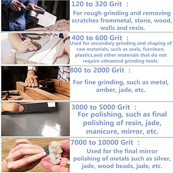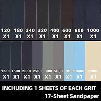 Farklı zımpara kağıdı türleri: 120/180/240/320/400/600/800/1000/1200/1500/2000/2500/3000/5000/7000/8000/10000 zımpara kağıdı sınıflandırması, her türden 1’er yaprak toplam 17 parça zımpara kağıdı kabadan süper inceye tüm ihtiyaçlarınızı karşılayabilir.