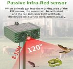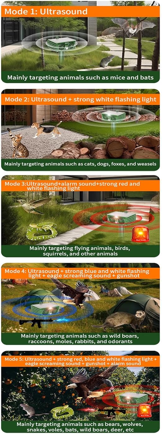 【Basit】Haşere kovucuyu kurmak ve kullanmak çok basittir. Cihazı istediğiniz açık alana kurmanız yeterlidir ve hayvanlar algılandığında otomatik olarak etkinleşir. Ultrasonik, yanıp sönen LED veya alarm sesi gibi seçilen çalışma modu, haşereleri etkili bir şekilde kovmak için tetiklenecektir.