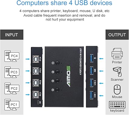 Tak ve çalıştır USB paylaşım şalteri, sadece klavye ve fareyi bu USB anahtarına bağlayın ve bir klavye ve fare seti 4 ana bilgisayarı sorunsuz bir şekilde kontrol edebilir. Kablosuz fare ve mekanik klavye desteği.