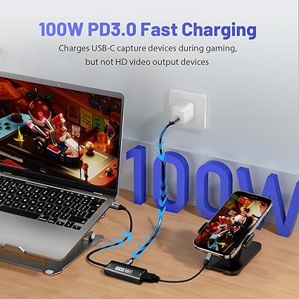 【PD 100W Hızlı Şarj】 Cihaz, hızlı çekim için tak ve çalıştır özelliğine sahip PD 3.0 100W hızlı şarj ile donatılmıştır ve canlı yayınlar veya uzun kayıtlar sırasında USB-C cihazları için istikrarlı güç kaynağı sağlar oturumları (şarj USB-A adaptörü tarafından desteklenmez; Şarj işlemi yalnızca şarjı destekleyen C bağlantı noktalarında gerçekleştirilebilir). Not: Aynı hızlı şarj hızına ulaşmak için 100W şarj cihazı gereklidir; Yakalama kartı şarj sırasında biraz ısınabilir, ancak bu normaldir