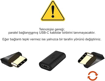 Type-C teknolojisi gereği ürün yalnızca tek yönlü çalışmaktadır. Taktıktan sonra ürün çalışmaz ise bağlı kablolardan bir tanesi çıkartıp yönünü değiştiriniz.