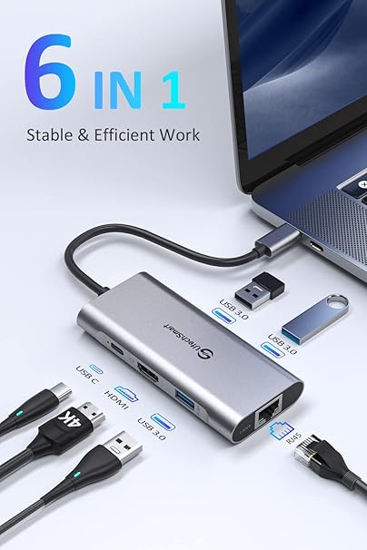 【6’sı 1 arada USB C Hub】Dizüstü bilgisayarınızı bir USB C bağlantı noktasından 4K HDMI bağlantı noktasına, 1000M Gigabit Ethernet RJ45 bağlantı noktasına ve bir USB Tip C güç dağıtım bağlantı noktasına ve 3 USB 3.0 bağlantı noktasına genişletin. Bu USB-C hub’un tüm bağlantıları aynı anda kullanılabilir, böylece klavye, fare, USB sürücü ve harici sabit diskleri sorunsuz bir şekilde dizüstü bilgisayarınıza bağlayabilirsiniz. Tüm iş ve eğlence ihtiyaçlarınızı verimli bir şekilde karşılayın. Paket 1 x 6’sı 1 arada USB C Hub, 1 x kullanım kılavuzu (Türkçe olmayabilir) içerir.