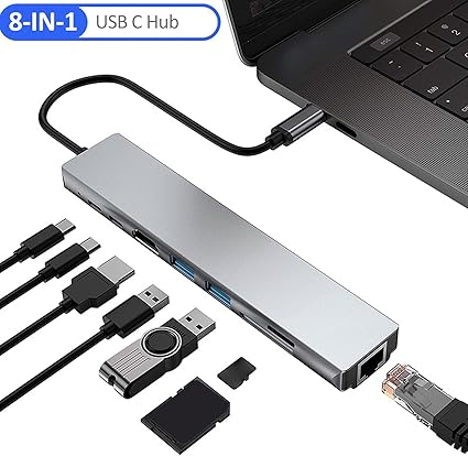 [8’i 1 arada USB C Hub] Ethernet bağlantı noktası, PD şarj bağlantı noktası, 4K/30Hz HD bağlantı noktası, SD kart okuyucu, TF kart okuyucusu içeren çok bağlantı noktalı USB-C hub ile USB-C cihazlarınıza bağlanın , bir USB C veri bağlantı noktası ve 2 USB 3.0 Bağlantı Noktası.