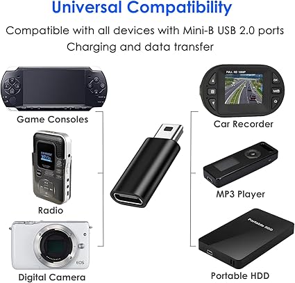 Evrensel Uyumluluk: Mepsies USB C – Mini USB Adaptörü, bir USB C kablosunu eski bir Mini USB Tip B bağlantı noktasına sahip cihazlara bağlamanıza olanak tanır. MP3 çalarlar, dijital kameralar, taşınabilir sabit diskler, oyun konsolları ve mini USB Tip B konektörlü diğer cihazlarla uyumludur.