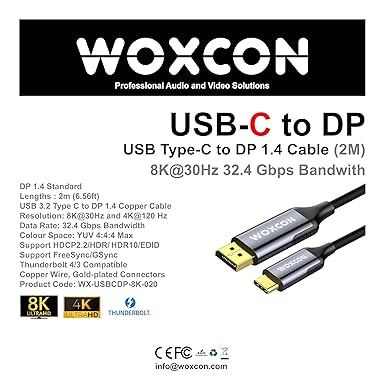 – USB-C to Display Port Cable, DP1.4, USB 3.2 Standart, 8K 30Hz, 4K 120Hz Desteği, Thunderbolt 4, Thunderbolt 3, 2 Metre, En Yeni Model