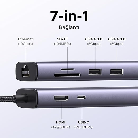 7’si 1 Arada USB C Dock – Devasa Genişleme: UGREEN USB C Multiport Dock, bir USB bağlantı noktasını 4K@60Hz HDMI, Gigabit Ethernet, 2 USB 3.0, SD TF kart okuyucu ve USB C PD bağlantı noktası dönüştürmeleri dahil olmak üzere 7’ye bağlar. Maks. 4K@60hz veya 1080P’yi destekleyen Macbook Pro, MacBook Air, iPad Pro, XPS 13 Book, Galaxy S23 gibi Type-C dizüstü bilgisayarlar veya tabletler için iyi bir arkadaştır.