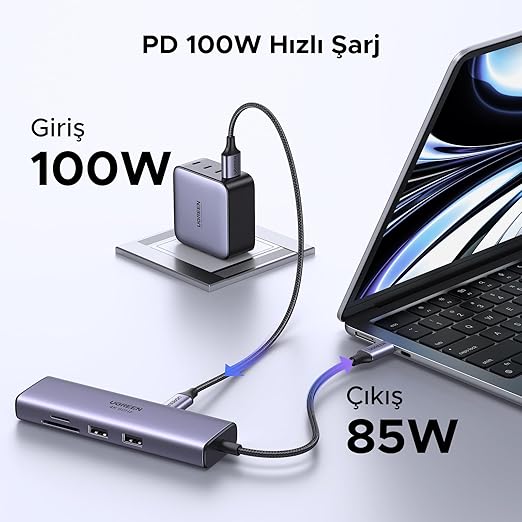 100W Güç Dağıtımı: USB C Dock PD, Güç Dağıtımı hızlı şarjı için özel olarak tasarlanmış bir C Tipi bağlantı noktasına sahiptir. 100W USB C bağlantı noktası, istikrarlı veri iletimi sağlamak ve uzun süreli çalışma için yeterli güç sağlamak üzere dizüstü bilgisayarlara güç sağlamak için kullanılır.