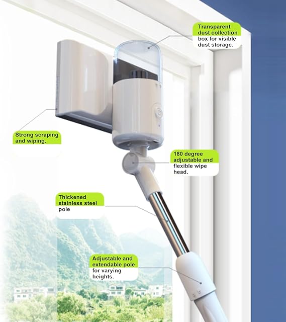 Özellik: 180 derece ayarlanabilir esnek silme başlığı, temizleme penceresinde ölü köşeler yok. Kuru ve ıslak silme için çift kullanım. 1. vites, ultrason tozu, vakumlama, 2. vites, bağımsız vakumlama. 4’ü 1 arada toz alma, vakumlama, kazıma, silme.